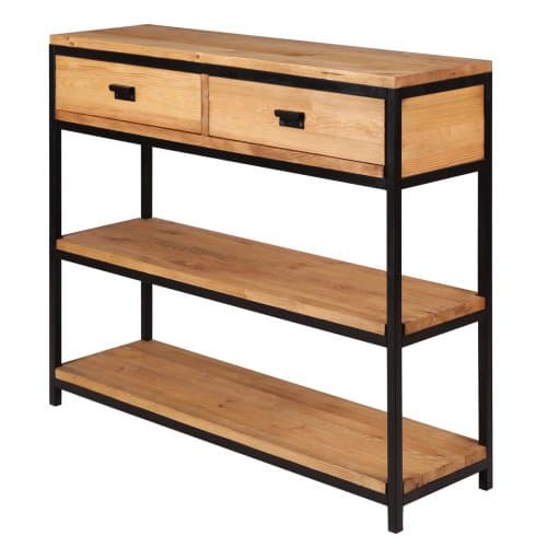Консоль 2 ящика KONS 2T+2N - компактный столик в современном исполнении с применением качественных и экологичных материалов. Стильный предмет мебели обладает внешней индивидуальностью, отлично впишется в спальную стиля Лофт. Оригинальное декорирование и грубоватая отделка не оставят равнодушными ценителей индустриального стиля. Простое и надежное изделие изготовлено полностью из натурального и качественного массива сосны с металлическими вставками. Белорусская фабрика обработала древесину с целью защиты от механических воздействий. Поверхность подверглась минимальной обработке, что не скрывает природную красоту дерева. Цвет реализации: "Натуральная сосна". Отделка: Вощение. Конструкция состоит из полок и двух выдвижных ящиков.