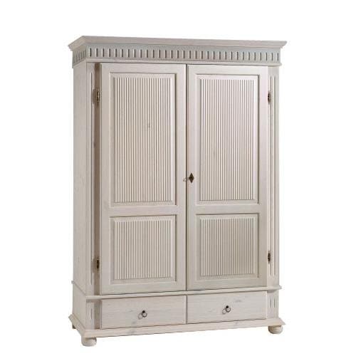 Шкаф Хельсинки 2GT изготовлен на белорусском мебельном предприятии ММЦ из натурального массива дерева - сосны. Конструкция системы хранения представлена двустворчатым отделением с распашными филенчатыми дверками, оснащенным штангой для плечиков, и двумя выдвижными ящиками, расположенными у основания модуля. Изделие выполнено в лаконичном сдержанном скандинавском стиле. Украшено декоративным профильным карнизом с элементами фрезеровки. Исполнение цветовой реализации представлено: "Белый воск", "Белый воск + Антик", "Белый воск + Кологиал". Структура дерева слабо просматривается. Покрыт экологически чистым и безопасным красителем, без добавления вредных примесей и запаха.