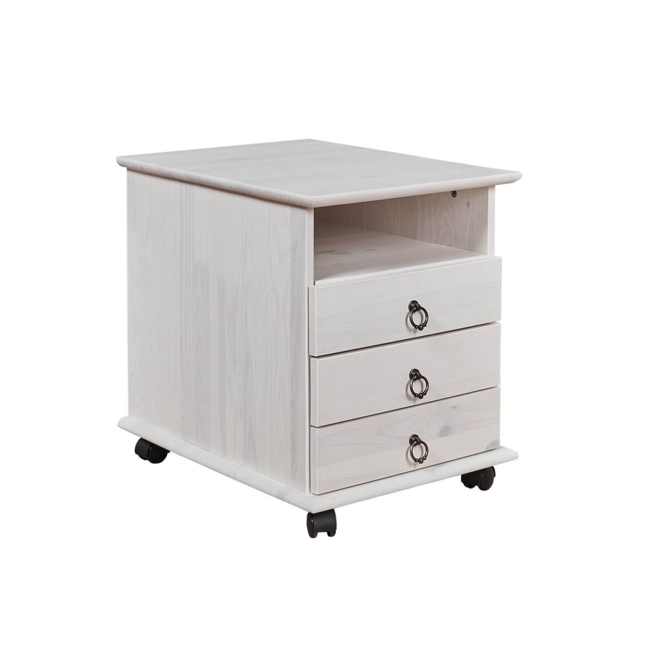 Тумба Хельсинки 03 изготовлена из массива сосны на белорусском мебельном предприятии ММЦ и покрыта экологически чистым и безопасным красителем без вредных примесей и запаха. Изделие имеет одну открытую нишу и три выдвижных ящика. В комплекте идет два типа ножек: пластиковые колеса или деревянные опоры. Варианты цветового исполнения: "Белый воск", "Белый воск" + "Антик", "Белый воск" + "Колониал", структура древесины слабо просматривается. Данную модель можно использовать как самостоятельную позицию, так и в сочетании с письменным столом Хельсинки 03.